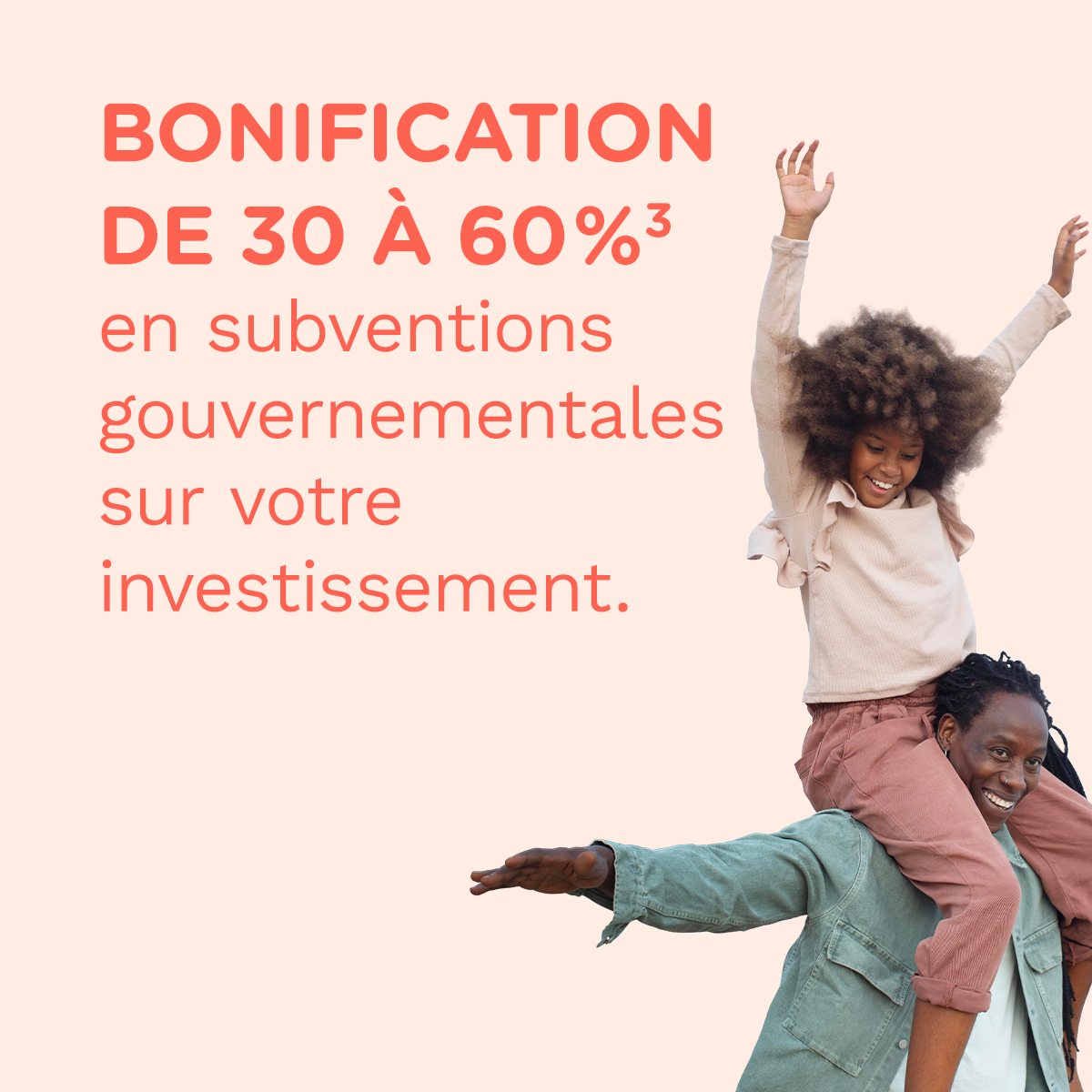 3. Subvention canadienne pour l’épargne-études (SCEE) de 20 à 40 %. Selon le revenu net familial rajusté. Incitatif québécois à l’épargne-études (IQEE) de 10 à 20 %. Selon le revenu net familial rajusté. Certaines conditions s’appliquent. Consultez notre prospectus à kaleido.ca.